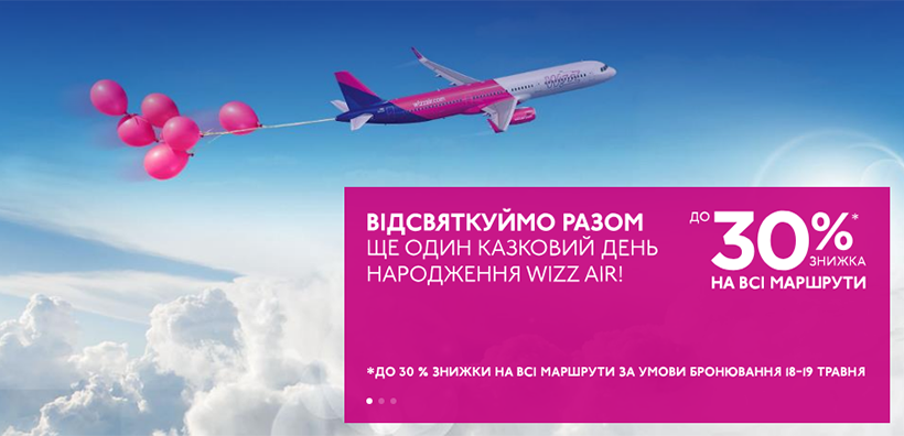 На честь свого Дня Народження авіакомпанія Wizz Air пропонує знижку 30% на всі рейси та маршрути для всіх за умови бронювання квитків сьогодні, 18 травня.