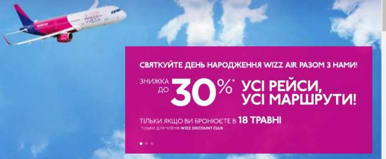 На честь дня народження 18 травня авіакомпанія Wizz Air оголосила святкову акцію і надає 30% знижки на всі рейси. Акція діє для учасників Wizz Discount Club.