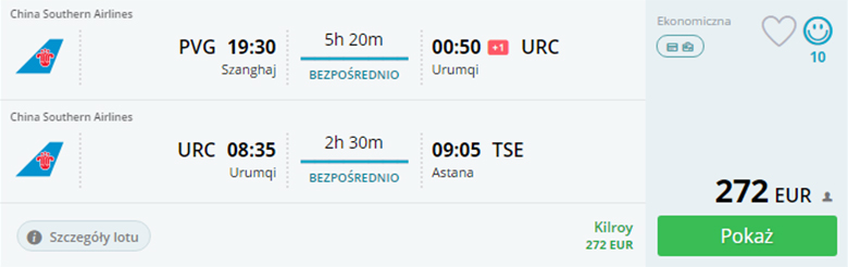 З Шанхаю летимо у китайський мегаполіс Урумчі. Рейс Шанхай – Урумчі – 19 вересня, вартість квитка 0 євро. І далі Урумчі – Астана, 24 вересня – €272 у обидва боки.