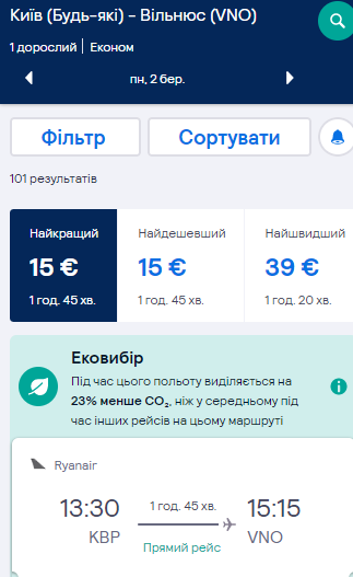 Дата: 2 березня. Ціна квитка в один бік – €15. Авіакомпанія – Ryanair.