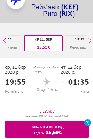 Вартість усіх квитків у дві сторони – €58 для учасників wizz-клубу та €82 для всіх. По дорозі з Києва у Рейк’явік буде пересадка у Вільнюсі, без ночівлі, на зворотньому шляху 1 ночівля у Ризі.
