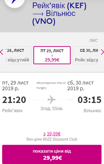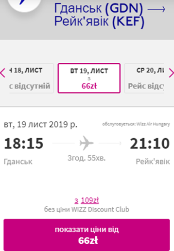 З 19 по 30 листопада можна запланувати подорож до Рейк’явіка. Квитки у два боки обійдуться у €75 для wizz-клубу та €111 для всіх інших. Летимо туди через Гданськ та назад – через Вільнюс.