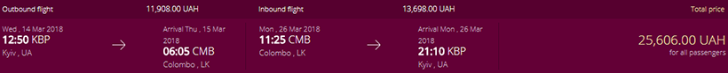 Путешествие из Киева в Коломбо можно запланировать на даты 14-26 марта. Стоимость перелета при бронировании билетов сразу для двоих пассажиров составляет €731,6 (€365,8 – за одного) в обе стороны. Летим через Доху. По дороге на Шри-Ланку ожидание в столице Катара составит 3 ч. 35 мин., а на обратном пути – 1 ч. 25 мин. В цену включено провоз ручной клади весом до 7 кг.