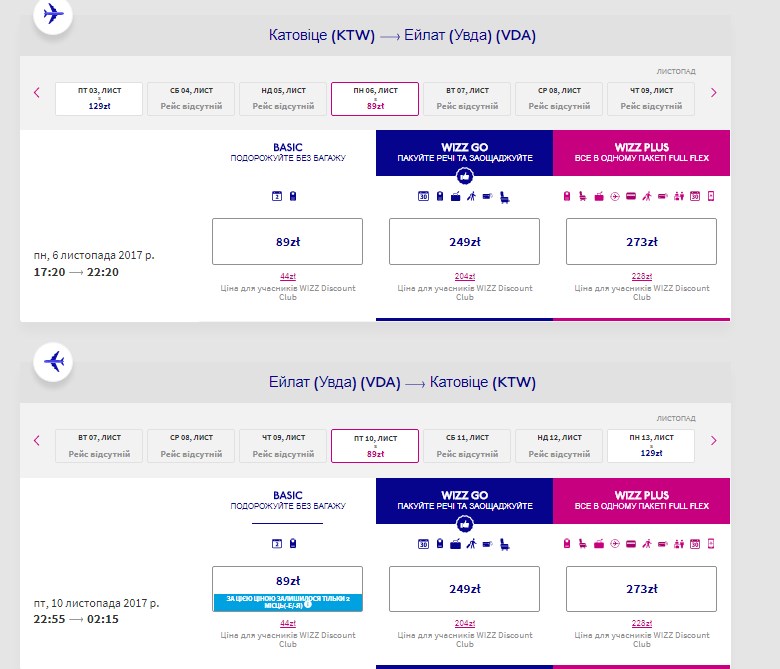 Отож, переліт Катовіце – Ейлат 6-10 листопада – 23 євро (Wizz club).