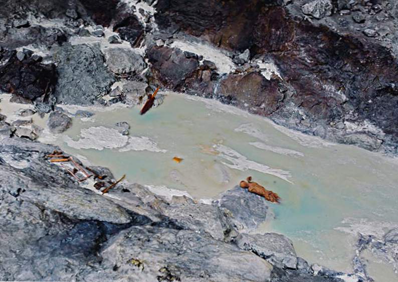 Цей знімок відтворює розташування тіла Етці і його спорядження в той момент, коли він був виявлений. При собі Етці мав два кошики, мідний сокиру, двометровий лук, кам’яний ніж, сагайдак зі стрілами. Всі ці предмети збереглися.