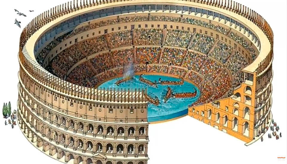 Існувала можливість заповнення арени водою для відтворення знаменитих морських битв. Нахил підлоги арени регулювався. Такі бої називалися Навмахія. Їх проводили тільки у виняткових випадках. При відкритті Колією в 80 році н.е. кораблі билися прямо на заповненій водою арені нового амфітеатру, зображуючи відомий бій 434 року до н. е. між керкірянами та коринтянами. Досі невідомі всі секрети надходження води до арени. Після будівництва підземних тунелів під ареною (за часів правління Доміціана) морські битви не проводилися. Для таких розваг побудувалися майданчики на природних водоймах.