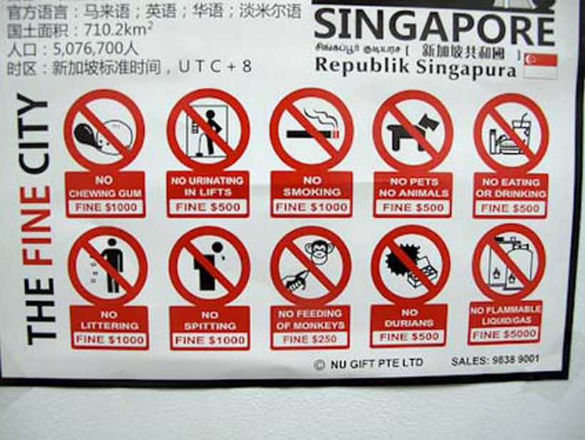 Сингапур – территория жестких санкций. Перешли улицу на красный свет? Перекусили – выпили в метро? Платите! Да, что там «красный свет»?! Жвачку нельзя привозить и жевать! Знаете, как легко она может загрязнить тротуар и как тяжело ее потом отодрать? Вот в Сингапуре и придумали простое решение: за ввоз и употребление жвачки – штраф в 500 сингапурских долларов. Так здесь борются за чистоту асфальтов и лифтов. Допускаются только никотиновые жвачки, и то только со справкой о необходимости их использования от врача.