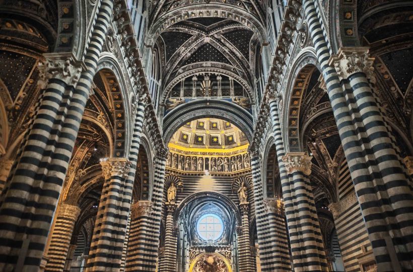 Сиенский кафедральный собор возведен в 12-14 вв. во времена процветания этого города-государства и своим внешним видом должен был демонстрировать его силу и возможности. Фасад сочетает готический и романский стиль. Над его созданием работали Джованни ди Чекко и Джованни Пизано.