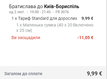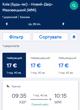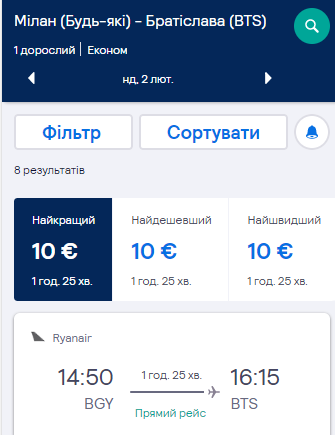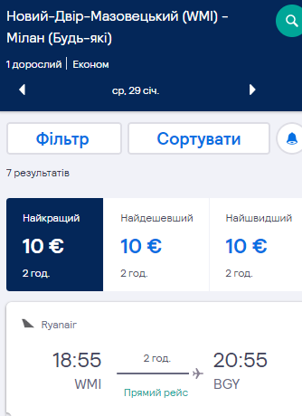 Дата – 29 січня. Вартість квитка на прямий рейс – €17.