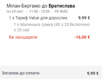 У вартість квитка входить ручна поклажа розмірами до 40х20х25 см.