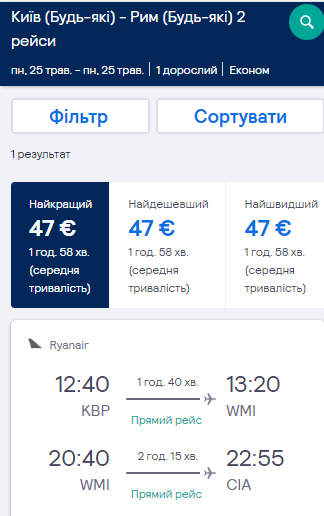 Дата: 25 травня. Вартість квитків в один бік —€47. Авіакомпанія: Ryanair.