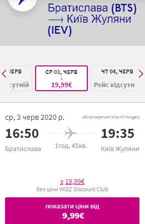 Дата: 3 червня. Ціна квитка — €10 для учасників wizz-клубу та €20 для всіх інших. Авіакомпанія: Wizz Air.