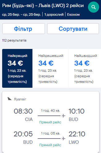 Дата: 25 березня. Вартість усіх квитків — €34. Авіакомпанія: Ryanair.