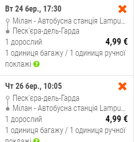 До озера Гарда курсують автобуси FlixBus. Час у дорозі – 1 год 50 хв. Є великий вибір часу відправлення автобусних рейсів.