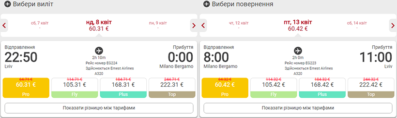 Дати – 8-13 квітня. Вартість квитків у два боки – €121. Вилітаємо з міжнародного аеропорту «Львів» імені Данила Галицького, прилітаємо в міжнародний аеропорт Оріо-аль-Серіо імені Караваджо (Мілан Бергамо).