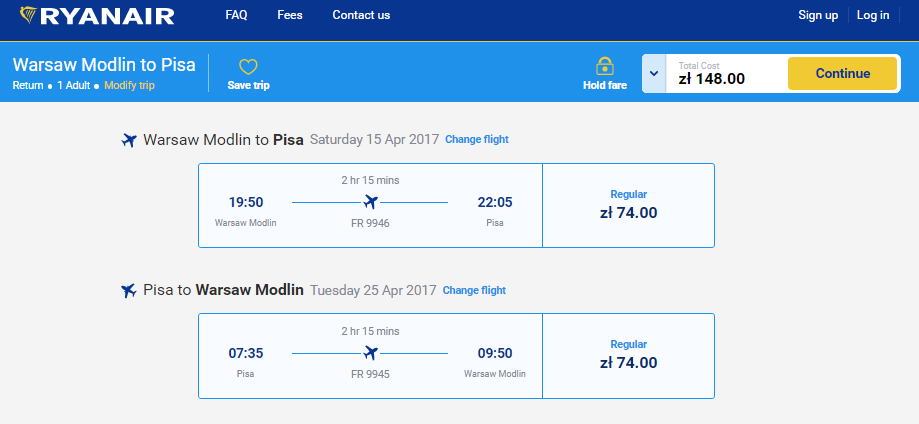 В этот же день в 19:50 садимся на самолет в аэропорту Варшава Модлин. Прилетаем в Пизу в 22:05. Рейс прямой, можно с собой взять ручную кладь, багаж в цену не входит. Стоимость билета на самолет €34 туда-обратно. Купить можно тут.
