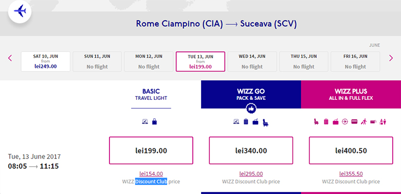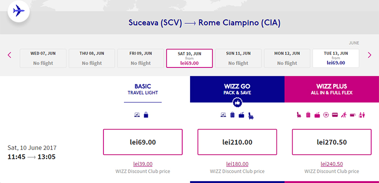 Сам перелет Сучава – Рим предлагает авиакомпания Wizz Air. Для членов Wizz Discount Club цена составит €45 в обе стороны. Путешествие можно запланировать, например, на 10-13 июня. Однако, в июне и июле дешевые билеты доступны и на другие даты.
