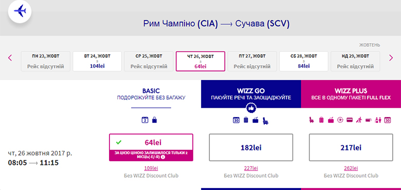 Запланировать путешествие в Рим можно на 19-26 октября. Прямой перелет из Сучавы предлагает уже знакомая нам авиакомпания Wizz Air. Цена билетов в обе стороны для участников Wizz Discount Club составит €30, а для всех остальных – €52.