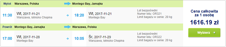 Экспертам Мандрии попался перелет из Варшавы в Монтего-Бей (Ямайка) всего за 1616 злотых или €380 в обе стороны. В стоимость включен провоз багажа весом до 20 кг. Даты путешествия – 21-28 ноября.