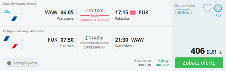 Летим из Варшавы в Фукуоку. По дороге в Японию будут пересадки в Амстердаме и Осаке, на обратном пути – в Осаке и Париже. Стоимость перелета в обе стороны – €406. Даты путешествия – 16-28 ноября.