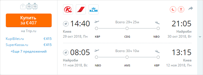 Київ – Найробі: 29 жовтня – 11 листопада 2018 року – 407 євро у два боки. Летіти через Париж, Шарль де Голль, зупинка займає 1 ніч (з 17 год до 11 год. наступного ранку). При перельоті назад пасажира чекає пересадка 3 год.