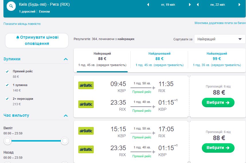 Забронювати можна квитки на прямі рейси з Києва, Львова та Одеси у Ригу, або в інші міста з пересадкою.