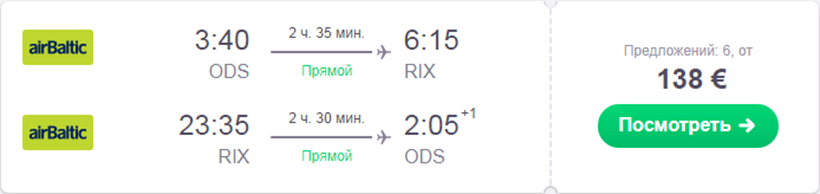 Прямой перелет Одесса – Рига и обратно можно запланировать на даты 7-13 апреля. Стоимость в обе стороны – €138. Перелет прямой.