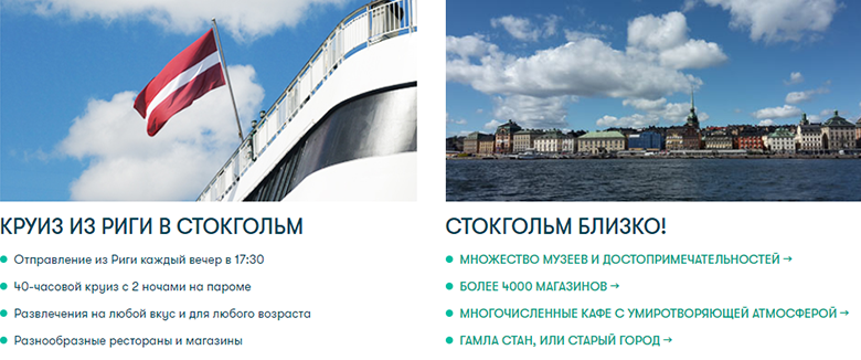 Крупнейший паромный оператор на Балтике Тallink предлагает недорогие билеты на рейс Рига – Стокгольм и обратно от €20 с чел. в 4-местной каюте или €80 каюта (от 1 до 4 чел.).