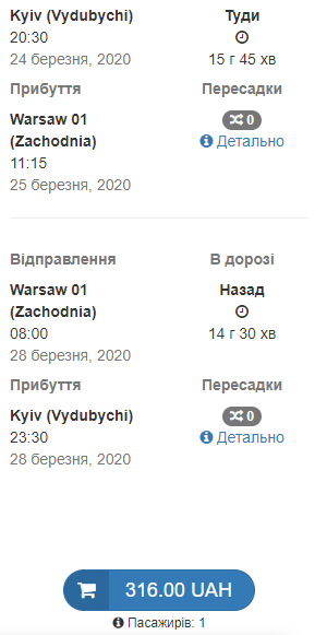 Дати: 24-28 березня. Вартість квитків у два боки — 316 грн