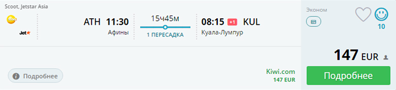 Є можливість за такою ж схемою летіти у Куала-Лумпур за 201 євро в один бік (€54 – переліт з Київа до Афін і €147 – вартість квитка з Афін до Куала-Лумпур).
