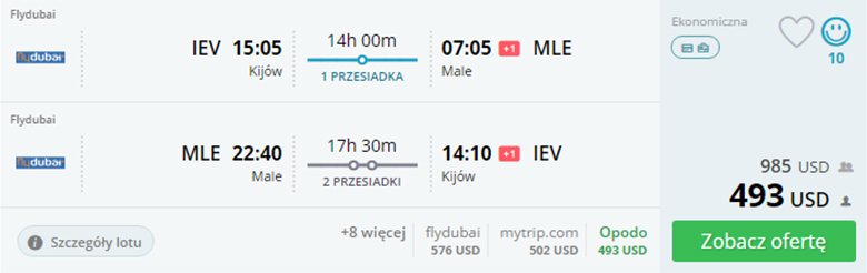 Переліт Київ – Мале пропонує авіакомпанія flyDubai. По дорозі на Мальдіви буде 1 пересадка в Дубаї, а на звороньому шляху – в Коломбо та Дубаї. Дати подорожі – 22-30 вересня. Вартість – $493 в обидва боки.
