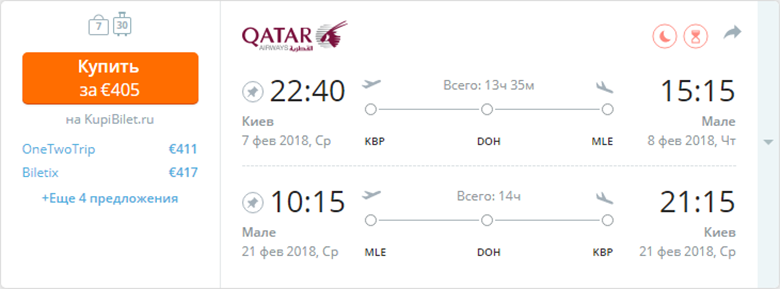 Маршрут – Киев – Мале. Стоимость – €405 туда-обратно. На пути будет пересадка в Дохе. По дороге на Мальдивы ожидание в столице Катара займет 3 ч. 15 мин., на обратном пути – 2 ч. 50 мин.