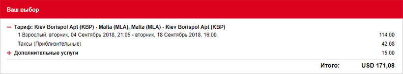 Квитки на нові рейси продаються за ціною від $171 в обидва боки з урахуванням зборів за тарифом Go Light, який передбачає тільки перевезення ручної поклажі. Квитки по тарифу Go Smart, що включає перевезення однієї валізи до 23 кг в багажі і вибір місця, продаються за ціною від $225 в обидва боки.1Про майбутнє відновлення авіакомпанією польотів до Києва повідомив в жовтні 2017 року міністр туризму Мальти Конрад Міззі.