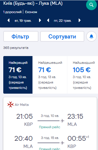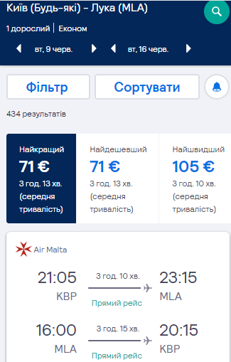 Забронювати квитки на прямі рейси з Києва на Мальту та назад можна лише за €71 на сайті авіакомпанії або на Skyscanner