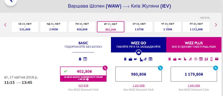 Київ – Варшава, 12-17 квітня – 26 євро у два боки для учасників Wizz club.