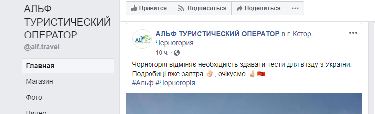 Учора туроператорр ALF через FB розповсюдив новину: Чорногорія відміняє необхідність здавати тести для в’їзду з України. Втім, офіційного рішення немає.