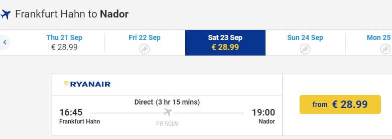 Далі – переліт у Марокко. Франкфурт – Надор, 23 вересня – €29 в один бік.