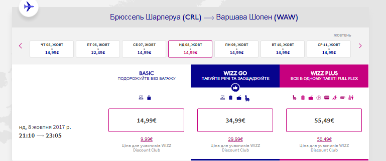 Брюсель – Варшава – 8 жовтня, €10 в один бік для членів Wizz club.