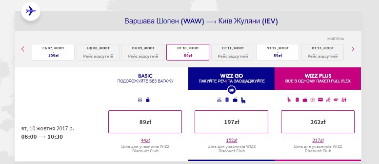 Варшава – Київ, 10 жовтня – €10 в один бік для членів Wizz club.