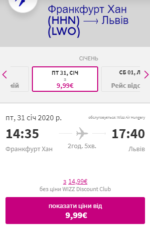 Дата – 31 січня. Вартість квитка в один бік — €10 для учасників wizz-клубу та €15 для всіх інших. Авіакомпанія – Wizz Air.