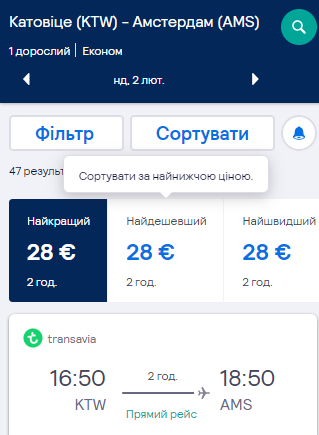 Дата — 2 лютого. Вартість квитка — €28. Авіакомпанія: Тransavia.
