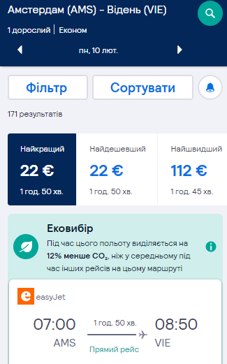 Дата — 10 лютого. Вартість перельоту в один бік — €22. Авіакомпанія: easyJet.