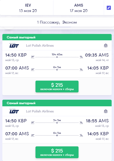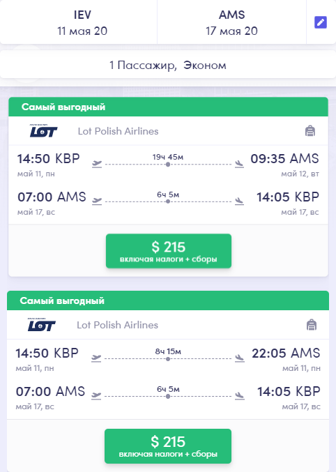Надаємо приклади перельотів на деякі дати з Києва в Нідерланди на період проведення Євробачення-2020.