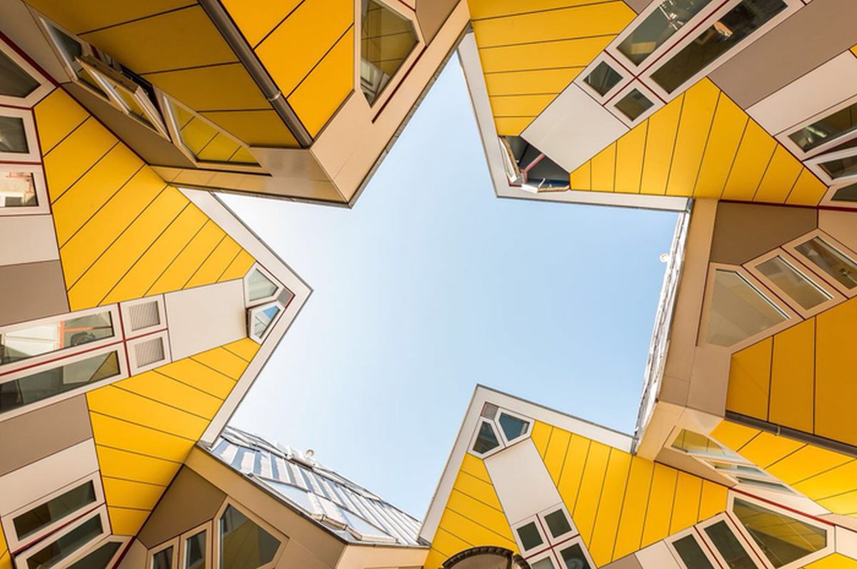 На улице Оверблаак и недалеко от одноименной станции метро 38 соединенных между собой трехэтажных домов поставлены углами на пилоны. Кубы состоят из трех уровней. На первом – кухни и гостиные, на втором – спальни и ванные, а наверху – сады. Большущие окна, стены пребывают по отношению к полу под углом 54,7°. В одной из квартир – Show Cube с видео, 3D-панелями и фотографиями о жизни в необычных домах. В некоторые домики можно проникнуть с их жильцами и осмотреть внутри.Сооружения созданы в 1984 г. Архитектурный проект Питера Блома.