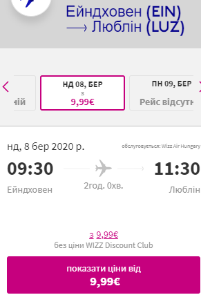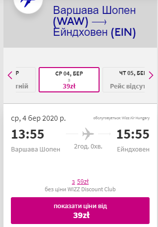 Наприклад, пропонуємо запланувати подорож з Києва в Ейндговен (Нідерланди) з 4 по 8 (або 11) березня. Ціна квитків у два боки – €39 для учасників wizz-клубу та €57 для всіх інших.