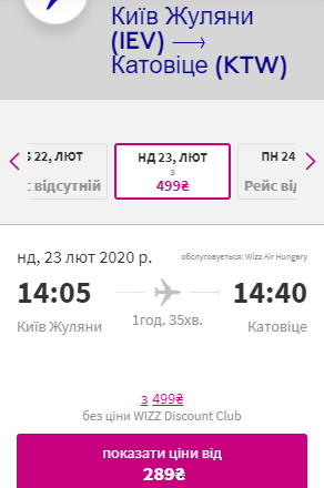 - Київ – Катовіце. Дата – 23 лютого. Ціна – €11 для учасників wizz-клубу та €21 для всіх інших.