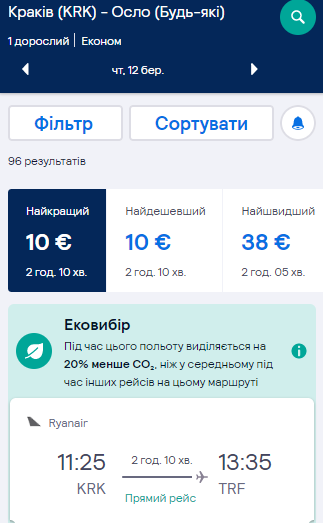 - Краків – Осло (Торп). Дата – 12 березня. Ціна – €10