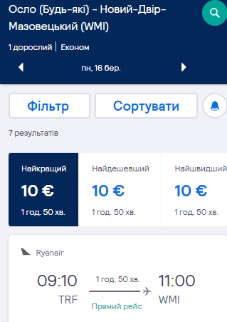 - Осло (Торп) – Варшава. Дата – 16 березня. Ціна – €10