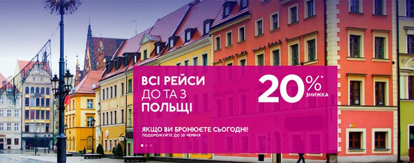 Wizz Air оголосила акцію: всім, кто забронює квитки до та з Польщі сьогодні, 29 травня, авіакомпанія пропонує знижку 20%. Подорож плануємо до 30 червня.