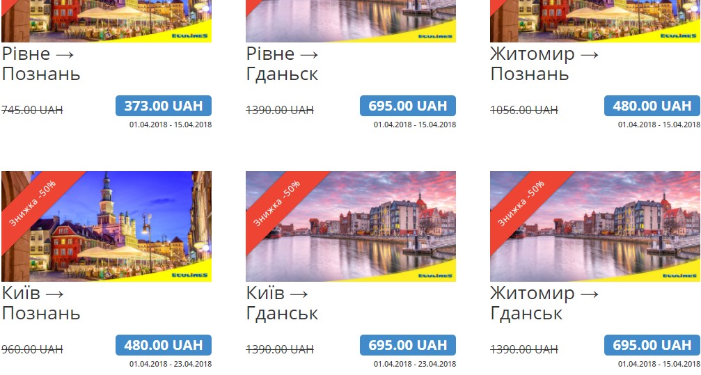 Автобусний перевізник Ecolines оголосив акцію на квітень: знижено на 40% вартість квитків у міста Польщі, Чехії на період подорожі з 6 по 26 травня. Квитки можна бронювати з 1 по 23 квітня.